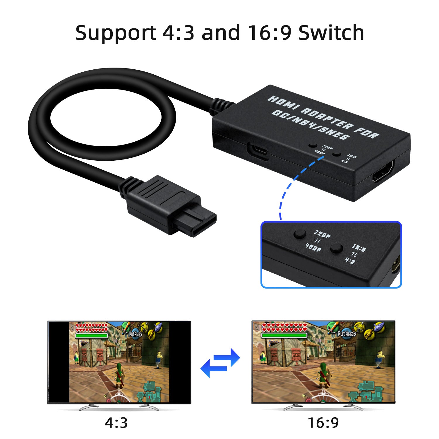 This HDTV HDMI Adapter allows you to connect GameCube/N64/SNES console to a HDTV and play games in 16:9 or 4:3 aspect ratio. Support switching between 480p or 720p resolution. Low latency. Provide clear and stable picture, play games without lag. Easy to hook up, plug and play, no drivers needed.