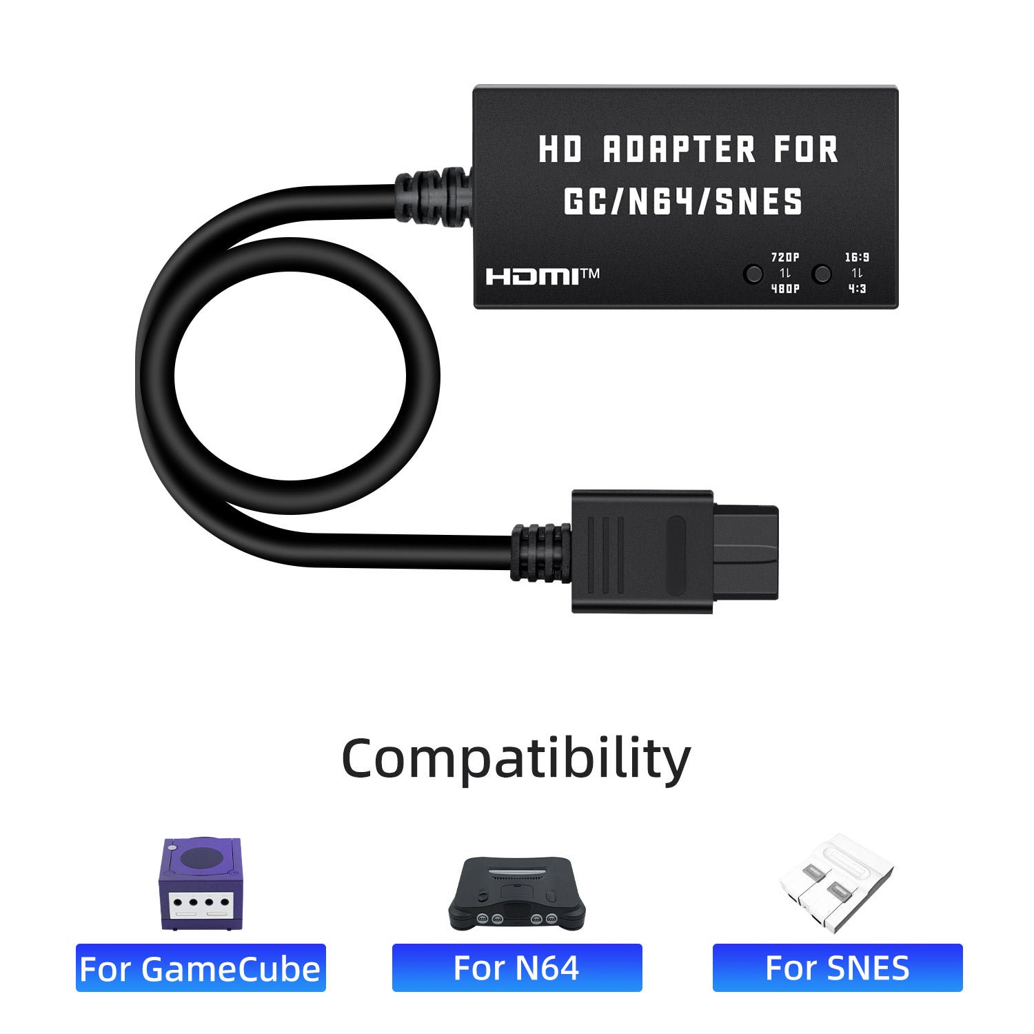 This HDTV HDMI Adapter allows you to connect GameCube/N64/SNES console to a HDTV and play games in 16:9 or 4:3 aspect ratio. Support switching between 480p or 720p resolution. Low latency. Provide clear and stable picture, play games without lag. Easy to hook up, plug and play, no drivers needed.